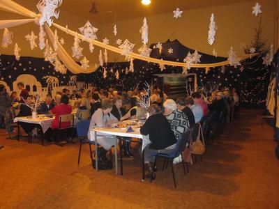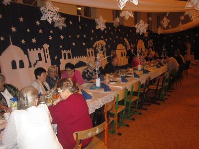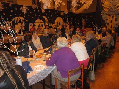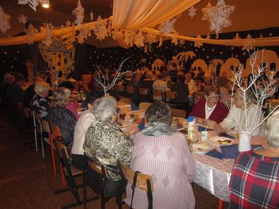 Życzenia przybyłym Seniorom złożyli obecni na spotkaniu dyrektorzy poszczególnych szkół z gminy Tuszyn. Tuż po nich nastąpiło łamanie opłatkiem i składanie świąteczno-noworocznych życzeń. Na koniec wszyscy zasiedli przy pięknie udekorowanych stołach aby spożyć przygotowany poczęstunek oraz wspólnie kolędować.