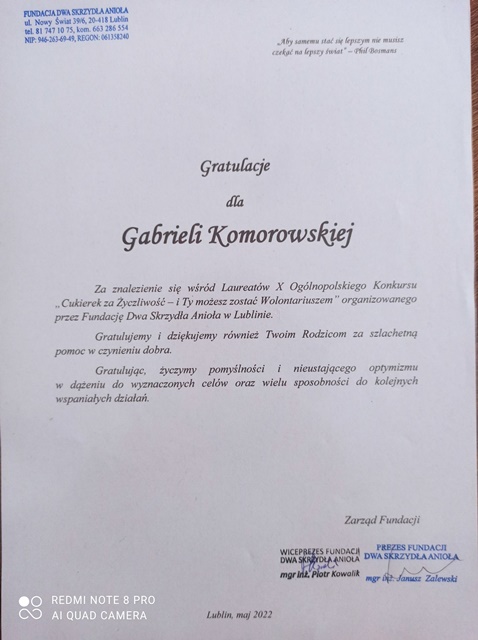 Serdecznie gratulujemy Gabrysi i życzymy dalszych sukcesów.