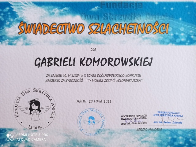 Celem ogólnopolskiego konkursu, organizowanego przez Fundację „Dwa Skrzydła Anioła” było uczenie młodzieży bezinteresownej pomocy osobom potrzebującym, we współpracy z rodzicami i czerpanie z tego satysfakcji. Organizator konkursu przyjął zasadę „Czym skorupka za młodu nasiąknie, tym na starość pachnie”. Zadaniem konkursowym było prowadzenie „Dzienniczka dobrych uczynków”, w którym na bieżąco należało dokładnie opisywać podejmowane działania z zakresu wolontariatu. Z naszej szkoły w konkursie udział wzięła uczennica klasy IV – Gabriela Komorowska. Gabrysia wykazała się wielką kreatywnością w prowadzeniu „Dzienniczka dobrych uczynków” i wielkim sercem w pomaganiu ludziom. Dzięki swej pracy charytatywnej i zaangażowaniu zdobyła 10 miejsce w Polsce (na 112 szkół) i tym sposobem znalazła się w gronie laureatów uzyskując „Świadectwo Szlachetności”.