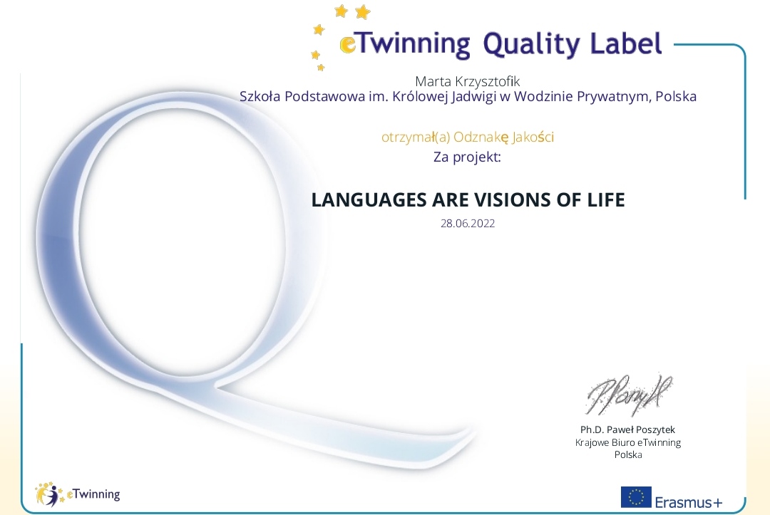 Miło nam poinformować, że 28 czerwca 2022 została przyznana naszej szkole Odznaka Jakości za projekt LANGUAGES ARE VISIONS OF LIFE - Odznaki Jakości eTwinning przyznawane są uczniom i nauczycielom za wybitne projekty eTwinning i są świadectwem pewnego krajowego i europejskiego standardu - M.Tomaszewska, M.Krzysztofik😊