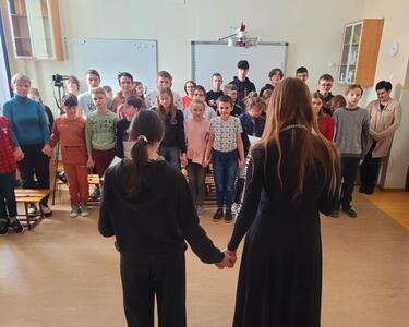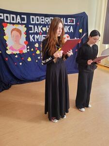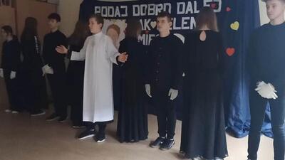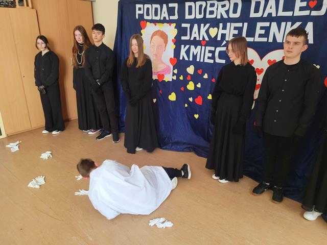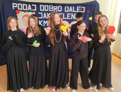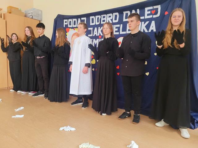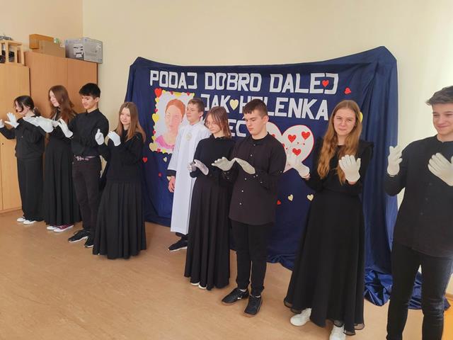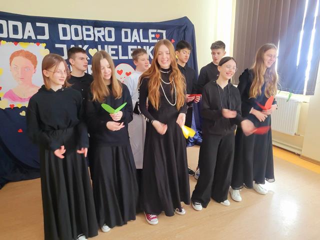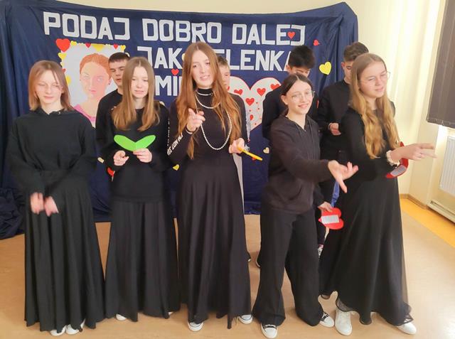W roku szkolnym 2022/2023 nasza szkoła przystąpiła do V edycji projektu „Podaj Dobro Dalej”, którego hasłem jest „Moc w rodzinie”. Jest to ogólnopolski projekt ukierunkowany na organizowanie akcji społecznej, nastawionej na pomoc drugiemu człowiekowi. Pragnę nadmienić, że w ubiegłym roku w IV edycji projektu, nasza szkoła odniosła wielki sukces, gdyż była w gronie laureatów najlepszych 10 szkół w Polsce i w nagrodę wolontariuszki wzięły udział w dwudniowej wycieczce do Krakowa. W ramach realizacji tegorocznej edycji projektu, w dniu 9 marca uczniowie klasy 7 zaprezentowali społeczności szkolnej pantomimę „Ręce”. Przedstawili oni również osobę i charyzmat śp. Heleny Kmieć, ze szczególnym nastawieniem na aspekt jej bezinteresownej pomocy drugiemu człowiekowi. Na koniec wszyscy uczniowie, promując ideę wolontariatu, zaśpiewali piosenkę o pomaganiu ludziom pt.” Kto jeśli nie Ty pomagać innym ma?”.
