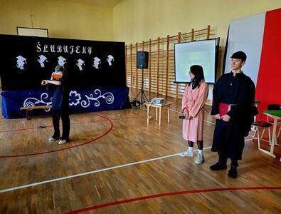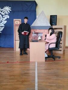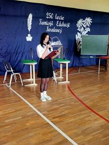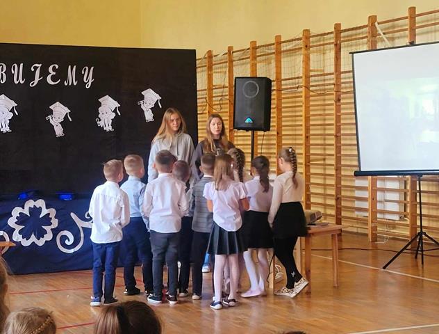 Po powitaniu wszystkich gości uczniowie z klasy 8 przedstawili prezentację multimedialną oraz krótkie scenki związane z historią edukacji w naszym kraju. W całość przedstawienia został pięknie wpleciony występ pierwszoklasistów, którzy zaprezentowali krótki program, składający się z wierszy i piosenek.