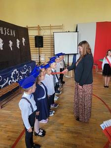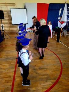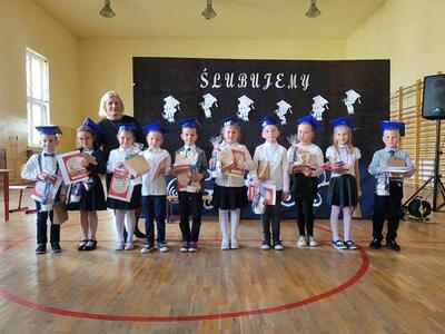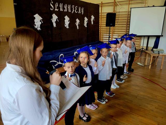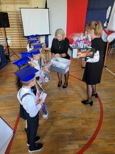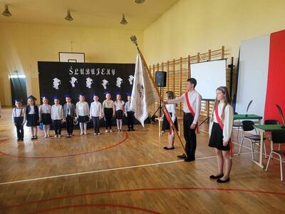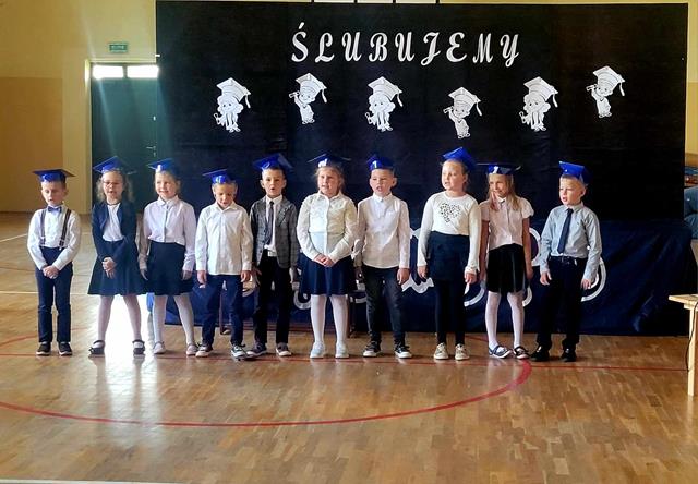 Po części artystycznej wprowadzono sztandar szkoły, na który uczniowie z klasy 1 złożyli uroczyste ślubowanie. Aktu pasowania na ucznia dokonała pani dyrektor Renata Wojtyla. W ten sposób pierwszoklasiści zostali oficjalnie włączeni do grona uczniów Szkoły Podstawowej im. Królowej Jadwigi w Wodzinie Prywatnym. Na pamiątkę tego ważnego wydarzenia każdy uczeń z rąk wychowawczyni otrzymał dyplom pasowania na ucznia i legitymację szkolną. Nie zabrakło też słodkich upominków przygotowanych przez rodziców.