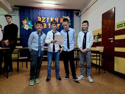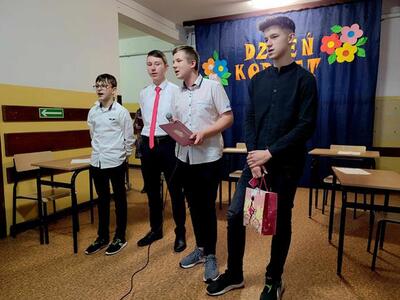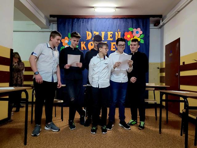 Tego dnia męska część Samorządu Uczniowskiego w asyście kolegów z najstarszych klas przejęła inicjatywę i zorganizowała miłą niespodzianę. Na ogóloszkolnym spotkaniu chłopcy złożyli wszystkim dziewczętom piękne życzenia, odśpiewali Sto lat i wręczyli małe słodkości.