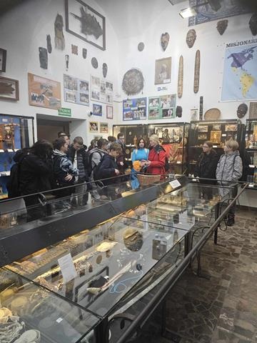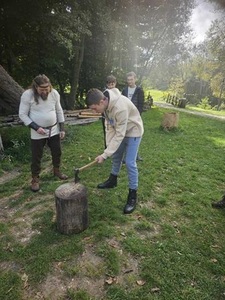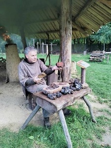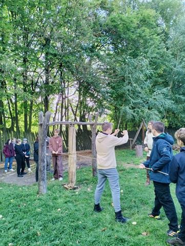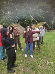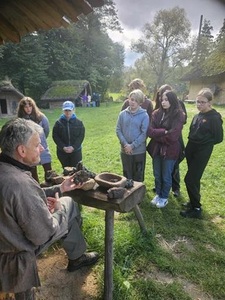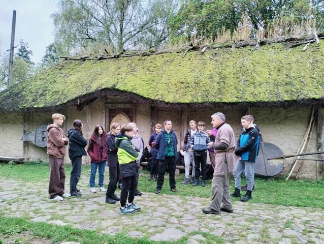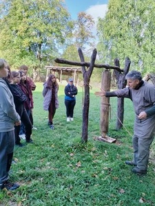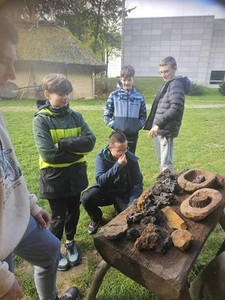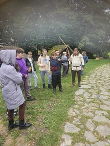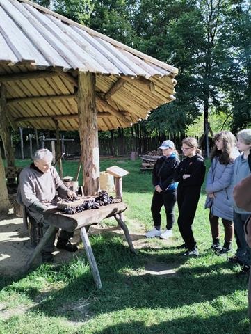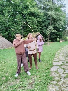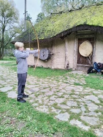 Drugiego dnia po śniadaniu pojechaliśmy do Nowej Słupi. Na początek skierowaliśmy swe kroki do Muzeum Starożytnego Hutnictwa Świętokrzyskiego. Tutaj czekały nas warsztaty: "Ogień i żelazo - starożytny, fascynujący świat hutników i kowali". W I etapie próbowaliśmy swych sił w rozpalaniu ognia świdrem ogniowym. To zadanie wymagało sporo siły. Nie było łatwo, ale udało się - pokazał się dym! Następnie prowadzący podpalił dymarkę i opowiadał, jak kiedyś wytapiano żelazo. W kolejnym etapie poznawaliśmy zasady działania starożytnego warsztatu kowalskiego. Obsługiwaliśmy miech kowalski, nauczyliśmy się podstawowych technik kucia żelaza. Teraz to jasne, dlaczego żelazo kuje się, póki gorące. Na koniec rzucaliśmy włócznią i strzelaliśmy z łuku. Szczęśliwcom udało się trafić w tarczę.