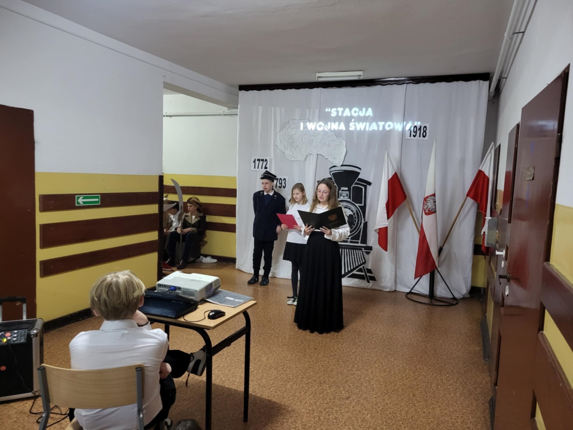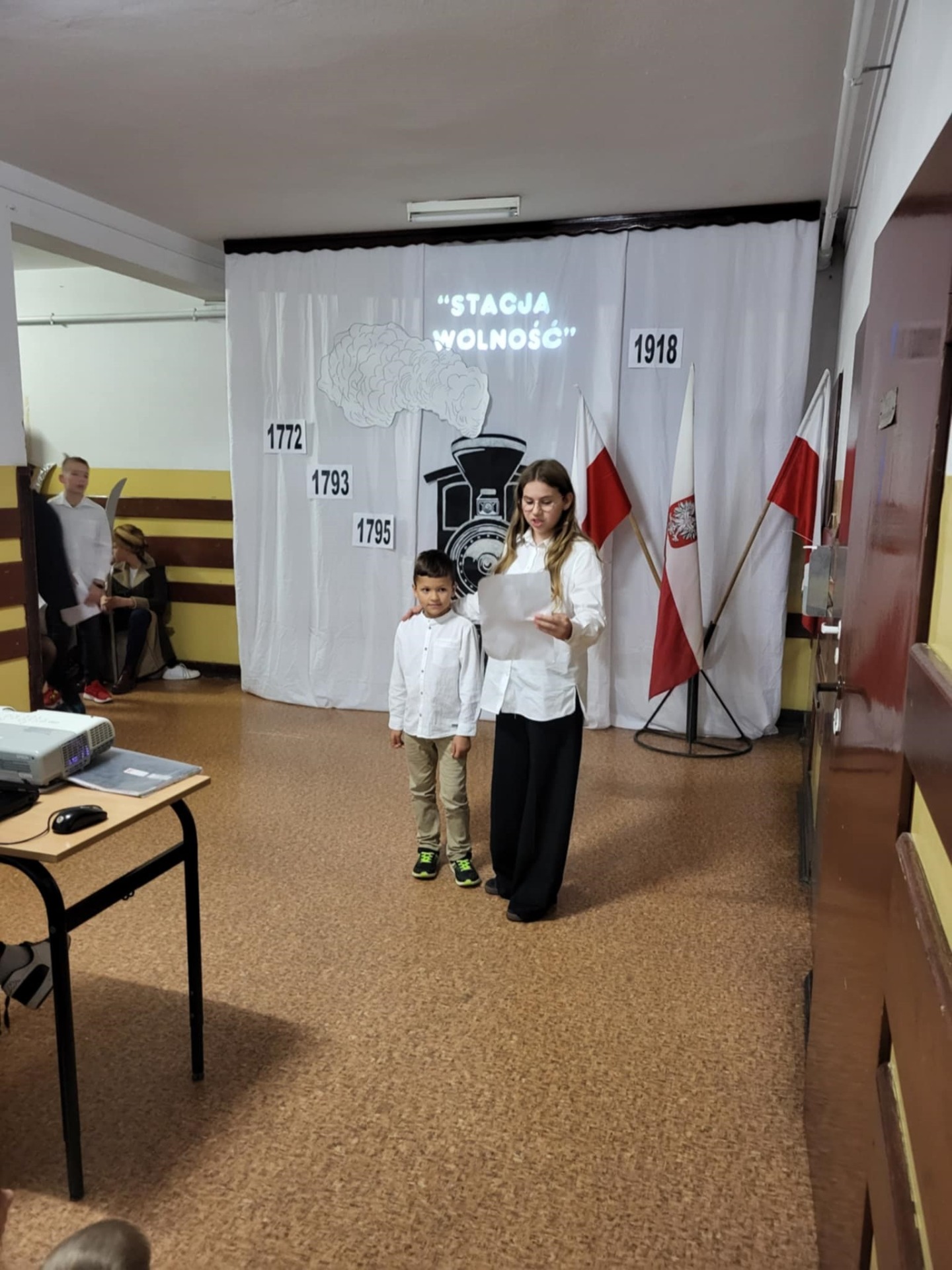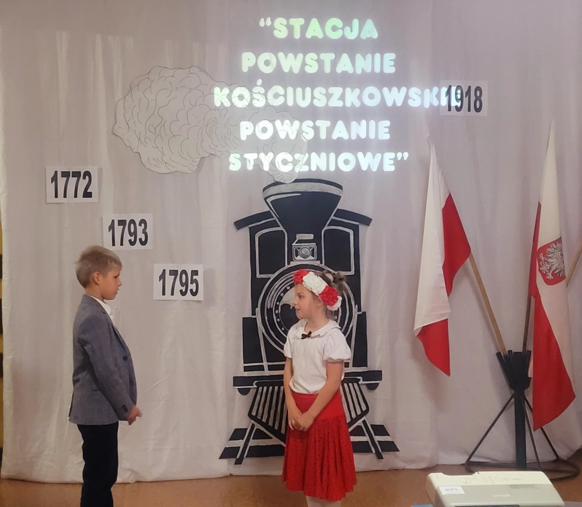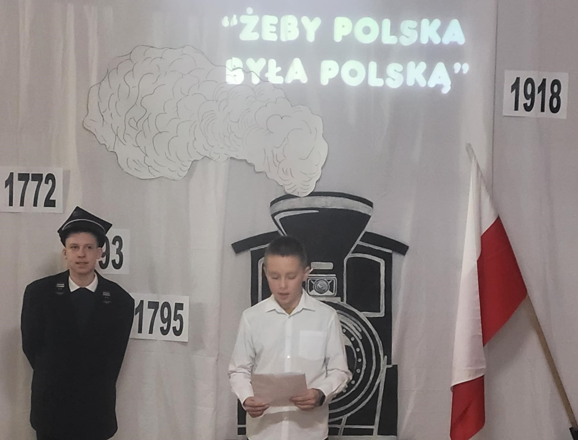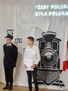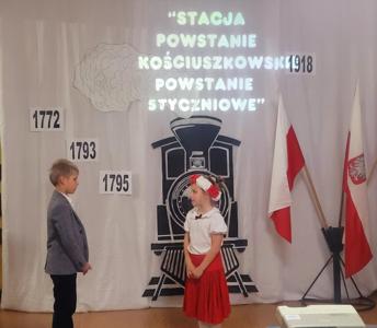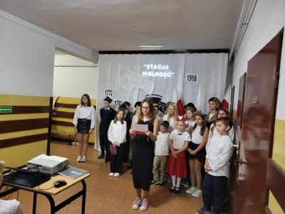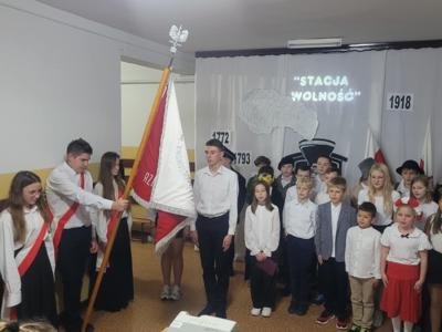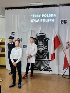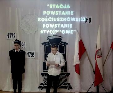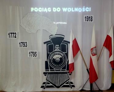 Uczniowie klasy V i VII recytując wiersze i śpiewając pieśni patriotyczne zabrali widzów w krótką podróż opowiadającą koleje losów Ojczyzny. Pociąg wyruszył ze stacji „Niewola” i w drodze do stacji docelowej „Wolność” zatrzymywał się na stacjach „Powstania” i „I wojna światowa”. Piękna recytacja, stroje dopasowane do tematyki, prezentacja multimedialna pozwoliły zrozumieć rozterki i uczucia walczących o niepodległość. Słowa utworów i wspaniałe deklamacje przybliżyły nam tragedię i ból Polaków po utracie wolności oraz radość i wzruszenie po odzyskaniu upragnionej niepodległości. Uroczystości towarzyszyła cisza, skupienie, powaga i zaduma.