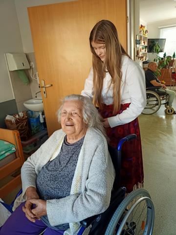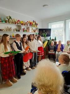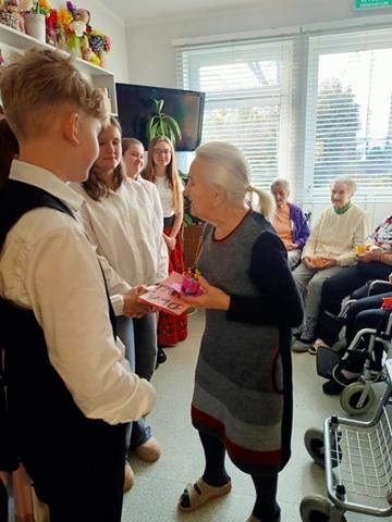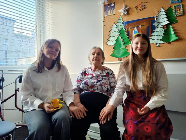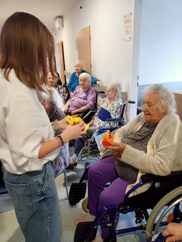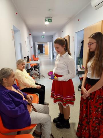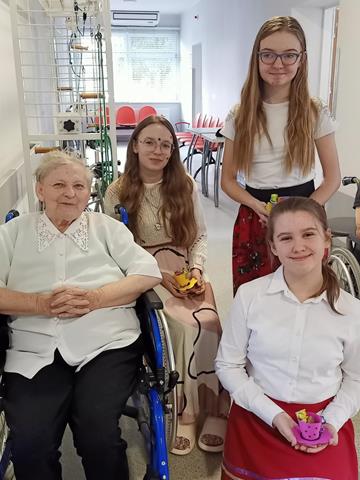 Podczas tego międzypokoleniowego spotkania, wolontariusze przedstawili krótką część artystyczną, tematycznie związaną ze świętem babć i dziadków pt. „Kiedy babcia była mała”. Złożyli podopiecznym życzenia oraz przekazali własnoręcznie przygotowane upominki wraz ze słodkościami.