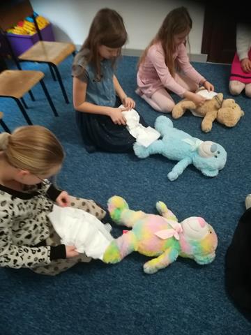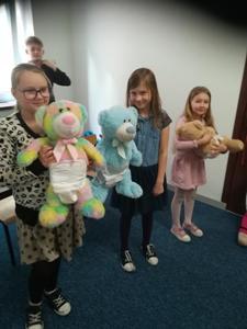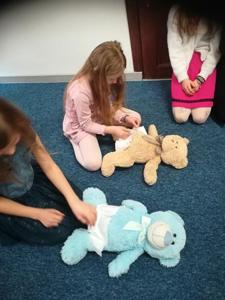 - wykazanie się umiejętnością przewijania małego bobasa (w tej roli wystąpił miś) :) i zakładanie mu pampersa,