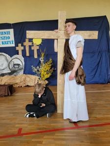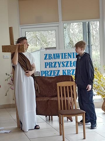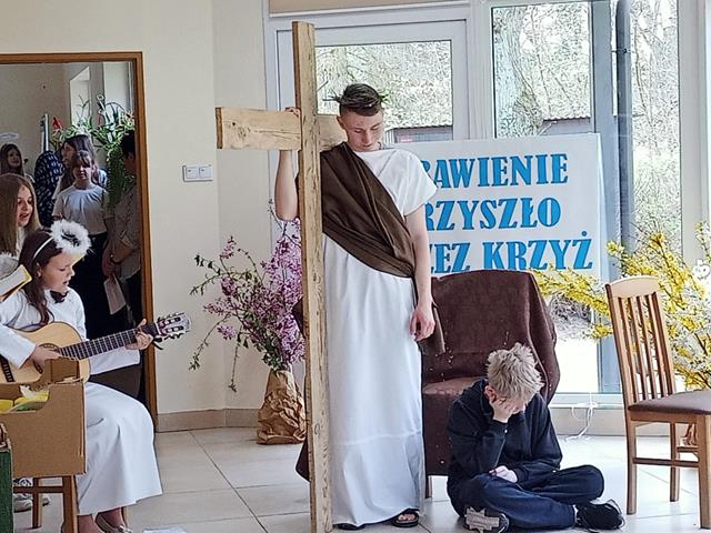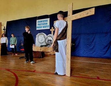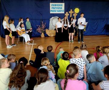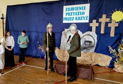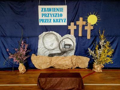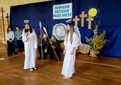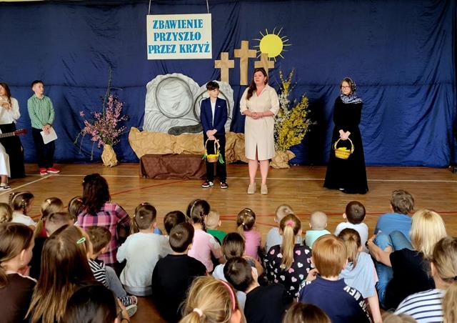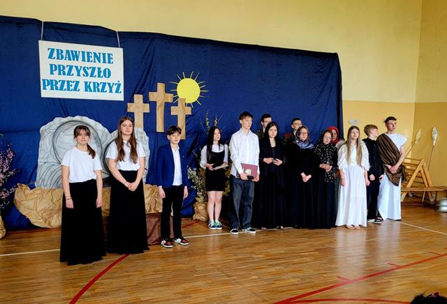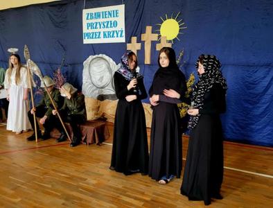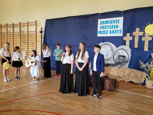 „Zbawienie przyszło przez krzyż” to tytuł montażu słowno - muzycznego, który z okazji zbliżających się Świąt Wielkanocnych przygotowali uczniowie klas V, VI, VII i VIII. Scenariusz przedstawienia nawiązywał do niezwykłych wydarzeń sprzed dwóch tysięcy lat. Mówił o potrzebie miłości i czynienia dobra we współczesnym świecie. Wielkopostne refleksje na temat męki Chrystusa przeplatały się z wymownymi w swej treści pięknymi pieśniami religijnymi.