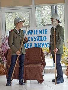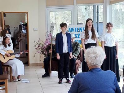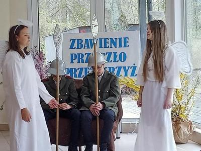 Młodzi aktorzy wprowadzili w atmosferę najstarszego i najważniejszego święta chrześcijańskiego najpierw występując przed pensjonariuszami Dziennego Domu Seniora WIGOR w Tuszynie a następnie przed społecznością szkolną.