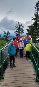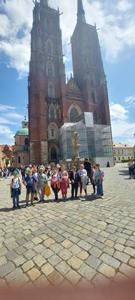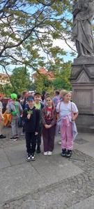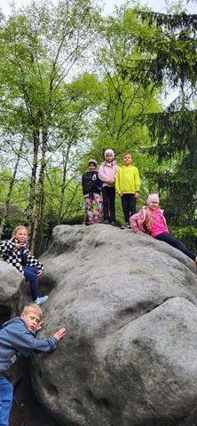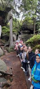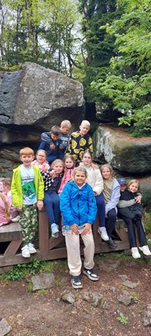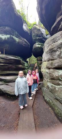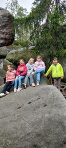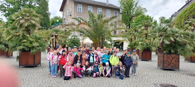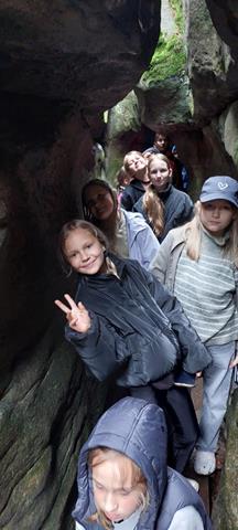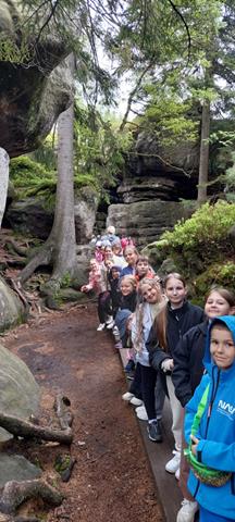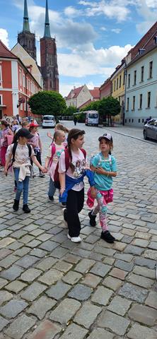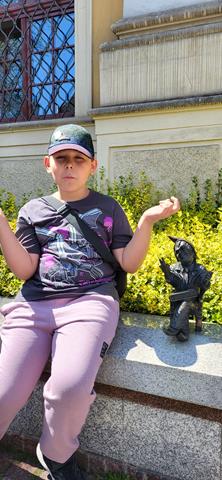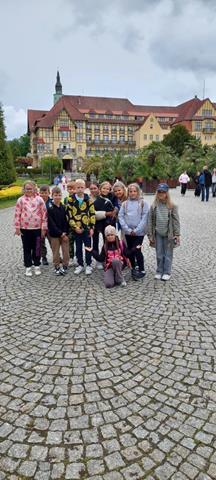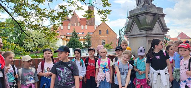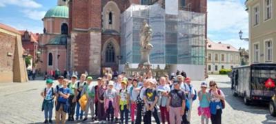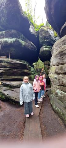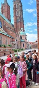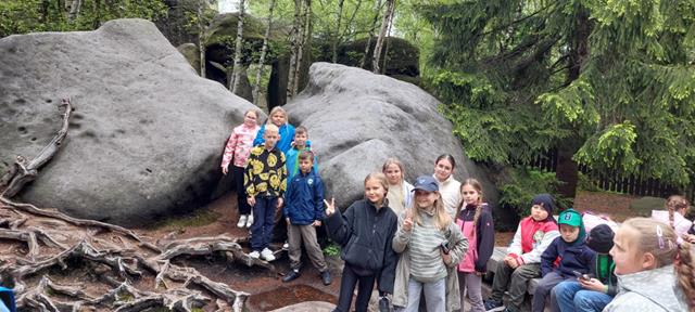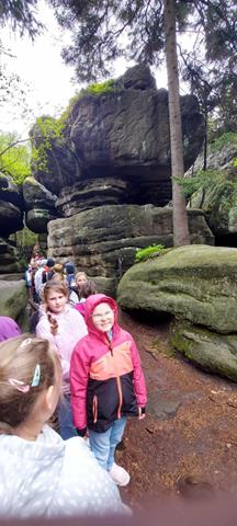 Środa w minionym tygodniu nie była zwykłą środą. Tego dnia 21.05.2025 uczniowie klas I-V wraz z opiekunami wybrali się na długo wyczekiwaną 3 dniową wycieczkę. Celem tej turystycznej wyprawy było poznanie rejonu Gór Stołowych oraz ciekawych przyrodniczo miejsc. Pierwszego dnia zwiedzaliśmy piękny Ostrów Tumski- to historyczna wyspa, która jest sercem miasta i najstarszą częścią Wrocławia. Spacerując z przewodnikiem mieliśmy okazję poznać historię tego miejsca oraz zobaczyć znajdujące się tam liczne zabytki, min. Katedrę św. Jana Chrzciciela, kościół św. Krzyża, rezydencję arcybiskupia, Most Zakochanych, Uniwersytet Wrocławski oraz Starówkę. Uczniowie z zaciekawieniem słuchali opowieści o historii miasta i jego zabytkach. Szczególnie podobały im się kolorowe kamienice i liczne krasnale, które zdobią wrocławskie ulice. Kolejny dzień był równie bogaty w atrakcje, choć plany programowe zostały trochę zmienione ze względy na pogodę. Najpierw udaliśmy się do Dusznik Zdroju i Kudowy Zdrój gdzie odwiedziliśmy Park Zdrojowy i Pijalnię Wód Mineralnych, a później drogą 100 zakrętów udaliśmy się do Parku Narodowego Gór Stołowych, żeby obejrzeć Błędne Skały. Poruszaliśmy się tylko wyznaczonym szlakiem po labiryntach skalnych, co tylko wzmogło naszą ciekawość. Nie rozczarowaliśmy się. Po drodze musieliśmy przeciskać się pomiędzy fantastycznie ukształtowanymi wytworami skalnymi w formie grzybów, maczug czy słupów. Nasz przewodnik ciekawie opowiadał o historiach i legendach tego miejsca. Dowiedzieliśmy się, że według legendy - Błędne Skały stworzył Liczyrzepa – Duch Gór. Następnym etapem naszej wycieczki było muzeum „Ginących Zawodów”. W muzeum znajduje się gospodarstwo składające się z kilku drewnianych chat, wiatrak, pracownia garncarska oraz mini zoo. Obejrzeliśmy też pokaz lepienia garnków i próbowaliśmy chleba wyrabianego tradycyjnym sposobem. Gospodarze obiektu przygotowali dla nas poczęstunek- ciepłe napoje, kiełbaski z ogniska, własnoręcznie pieczony chleb, z masłem lub smalcem – pycha! Dodatkową atrakcją obiektu było mini ZOO z ciekawymi zwierzętami: zebrą, wielbłądem, lamą, alpaką, małpkami i jeżozwierzami. Ostatni dzień wycieczki rozpoczęliśmy od spaceru po pięknym uzdrowisku w Polanicy-Zdrój, w którym skosztowaliśmy wody o działaniu leczniczym. Przeszliśmy się po parku zdrojowym, zobaczyliśmy Amfiteatr, Sanatorium, fontannę i wielką granitową kulę oraz "Polarnego niedźwiedzia, który jest symbolem Polanicy-Zdrój. Jego kamienny pomnik stoi w Parku Leśnym. Ostatnim punktem naszej wycieczki było zwiedzanie starej Kopalni Złota, gdzie czekało na dzieci wiele atrakcji, m.in. „duch” Gertrudy, przejazd, podziemną kolejką, jedyny w Polsce podziemny wodospad, wybijanie monet itp. Po zjedzeniu smacznego obiadu był czas na zakup pamiątek. Następnie wyruszyliśmy w drogę powrotną do domu. Wspomnienia z wycieczki pozostaną z nami na długo…