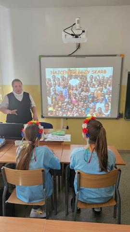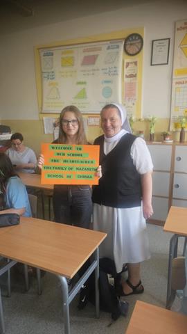 Realizacja międzynarodowego projektu „Szkoła Szkole” . Włączyliśmy się w zagraniczną akcję pomocową Fundacji „Dzieci Afryki” i objęliśmy patronatem szkołę w Afryce „Holy Family of Nazareth School" w Chiraa. Nawiązaliśmy współpracę z siostrą Nazaretanką Justyną Czerwińską, która jest dyrektorką tamtejszej szkoły. W celu pomocy dzieciom w Chiraa i pozyskania dla nich funduszy wolontariusze przeprowadzili w szkole: loterię fantową i zorganizowali akcję pieczenia tostów oraz zbiórkę środków do puszki. W dniu 23 kwietnia pani dyrektor Justyna Czerwińska była gościem w naszej szkole. To była niesamowita dla nas wizyta. Okazało się, że pani Justyna Czerwińska pochodzi z niedaleko położonych Pabianic i w czasie Świąt Wielkanocnych odwiedzi swoje miejsce rodzinne. Osobiście więc mogliśmy się spotkać z panią Justyną, porozmawiać z nią, jak również przekazać na ręce siostry zebrane przez nas fundusze w kwocie 2000,00 zł. na zakup ksero dla szkoły w Chiraa. Dla dzieci zakupiliśmy słodycze i wykonaliśmy też kartki świąteczne. Siostra Justyna obiecała naszym wolontariuszom, że nasza współpraca dopiero się rozpoczęła i nasi uczniowie będą mogli spotkać się na portalach społecznościowych już we wrześniu.