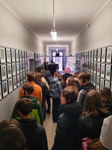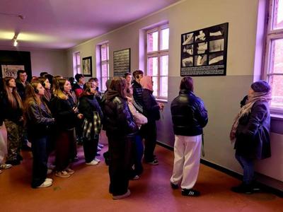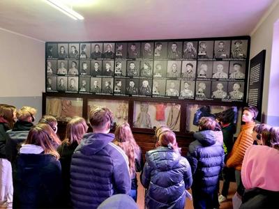 Uczniowie z ogromnym szacunkiem i skupieniem wysłuchali opowieści Pani Przewodnik, poznając losy ludzi, którzy przeszli przez te miejsca.
